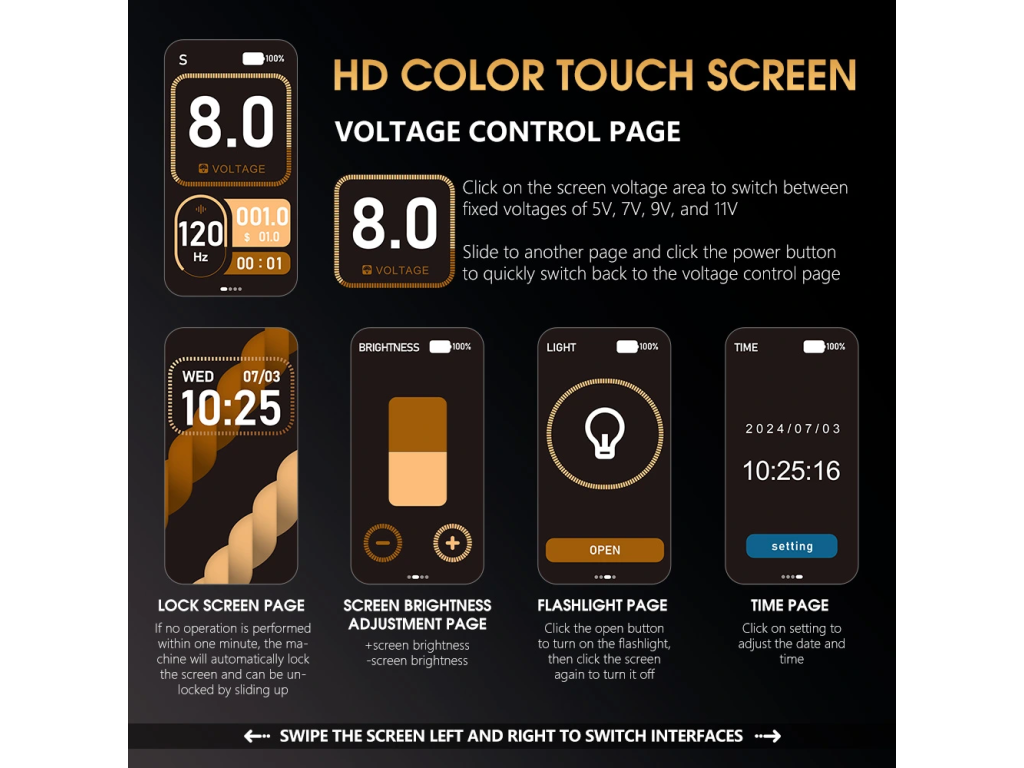 Schnelle Steuerung von Spannung und Zusatzfunktionen direkt am Farbdisplay.