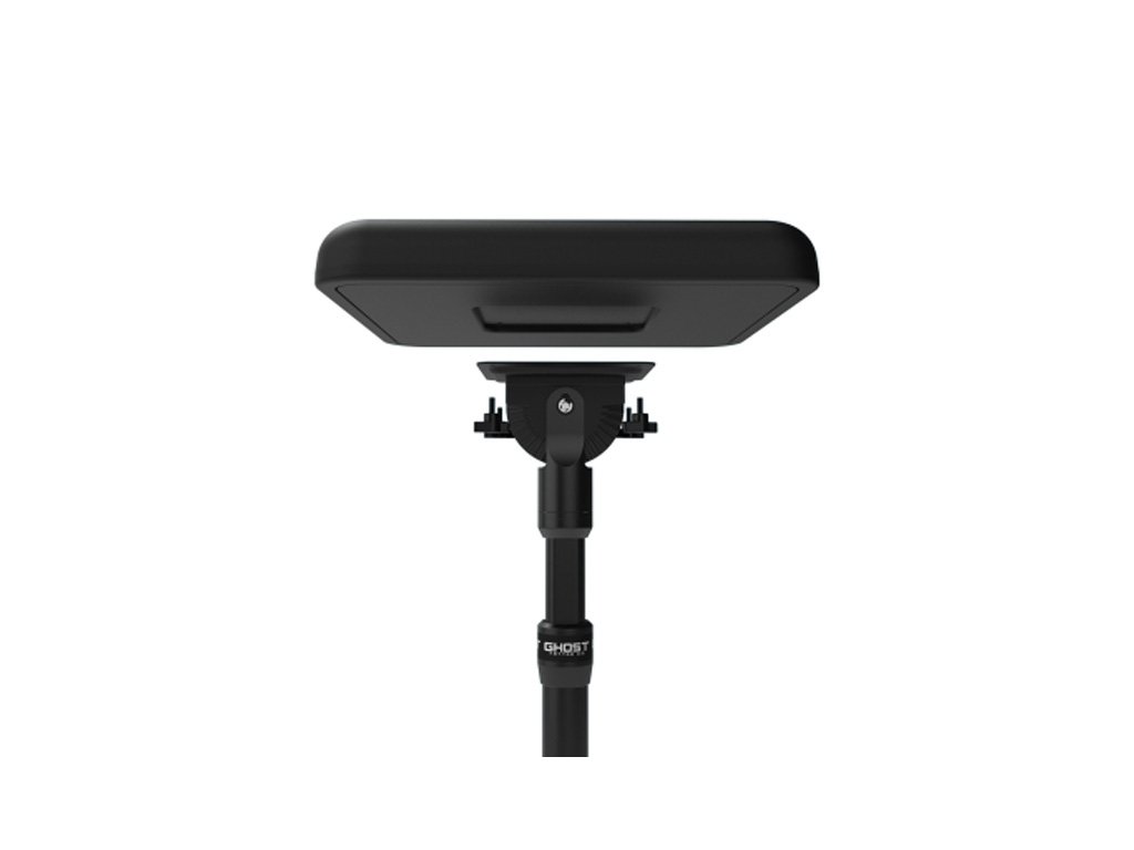 Das dreieckige Innenrohr sitzt auf stabilen Stativbeinen mit einem flachen Fußhebel, der unbeabsichtigtes Verschieben verhindert. Der Kragen ist mit dem Ghost Tattoo Co-Logo bedruckt, und die gesamte Struktur hat ein seidenmattes Finish.