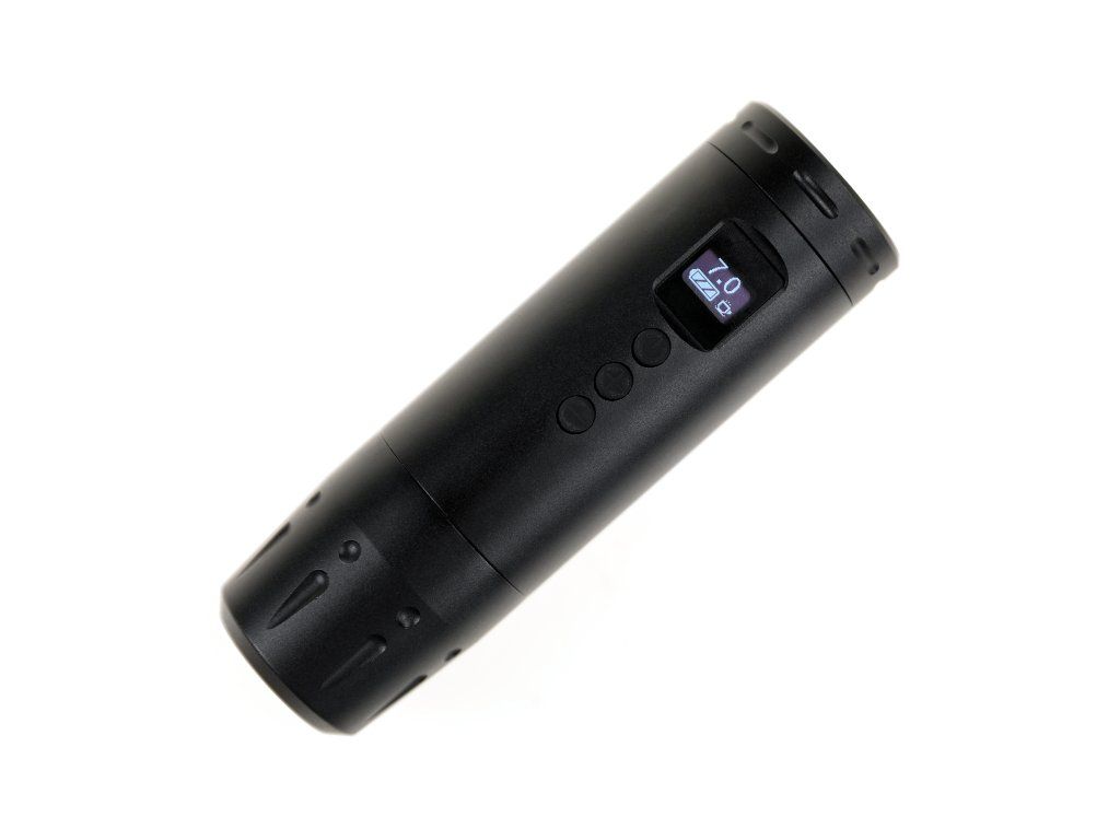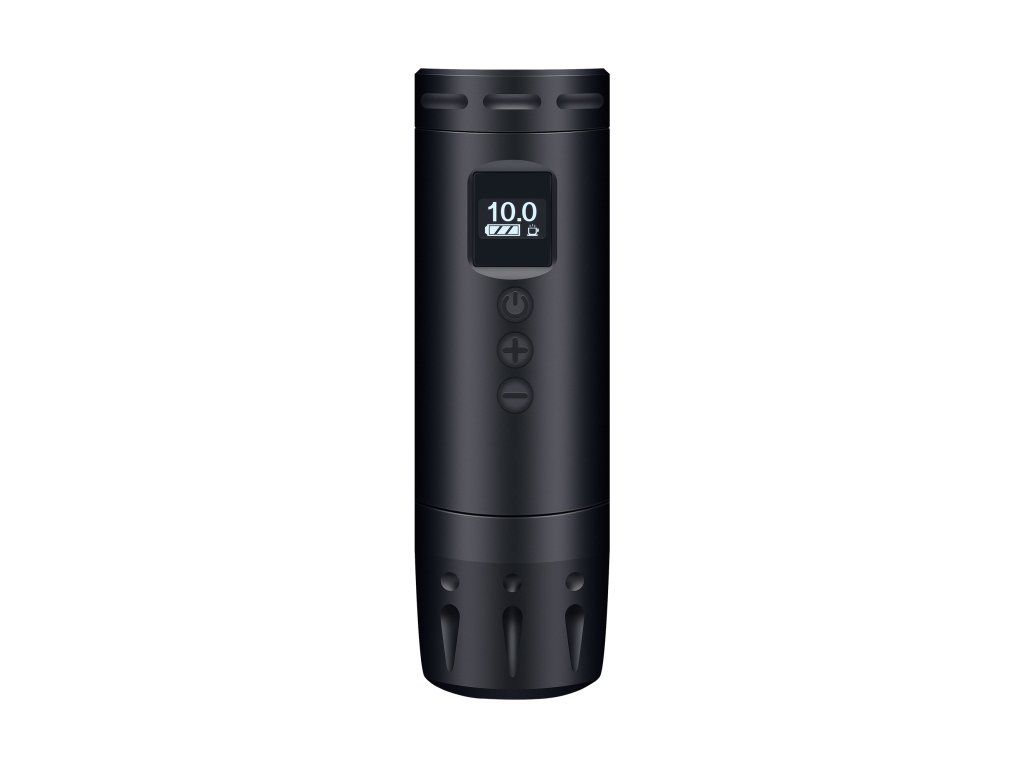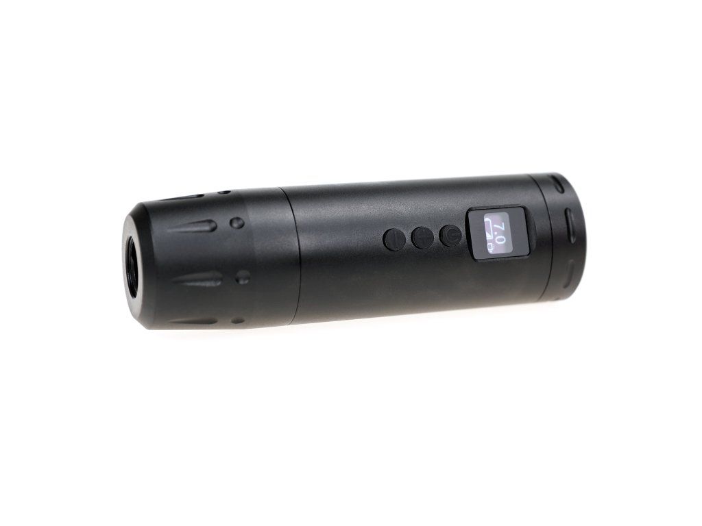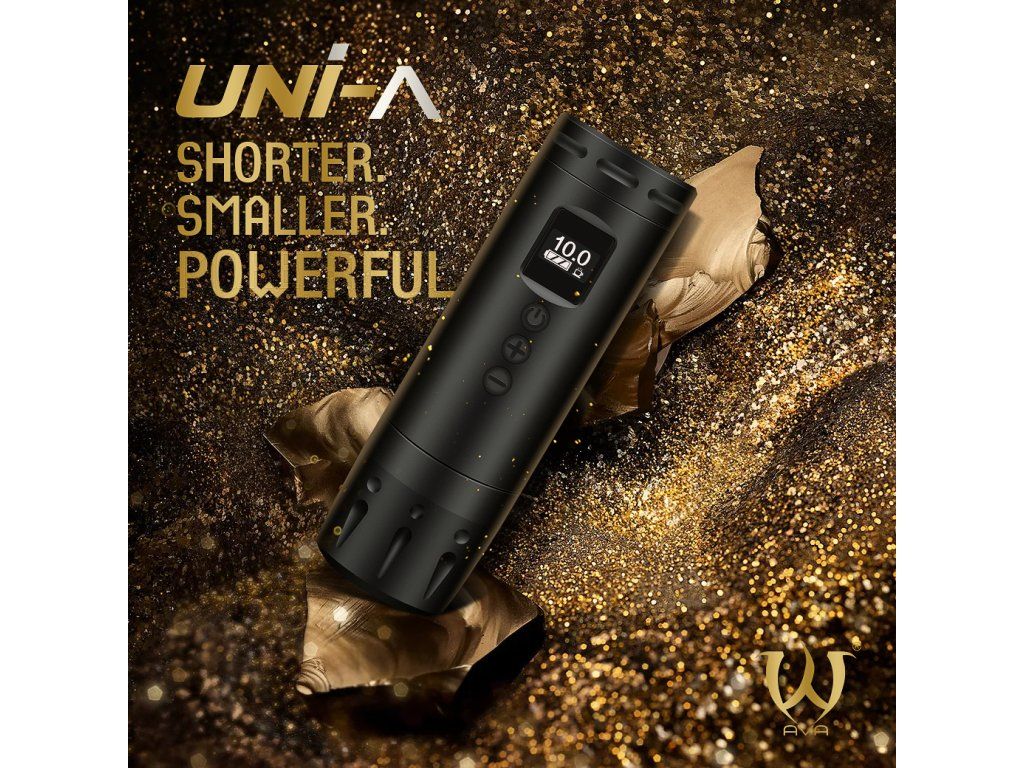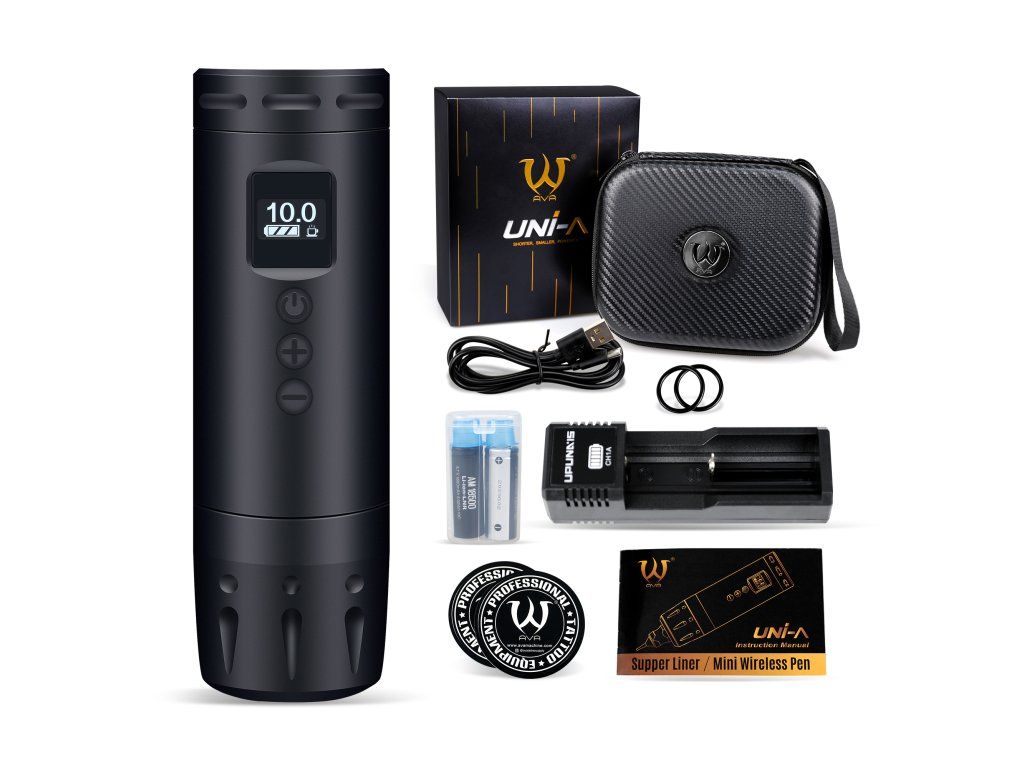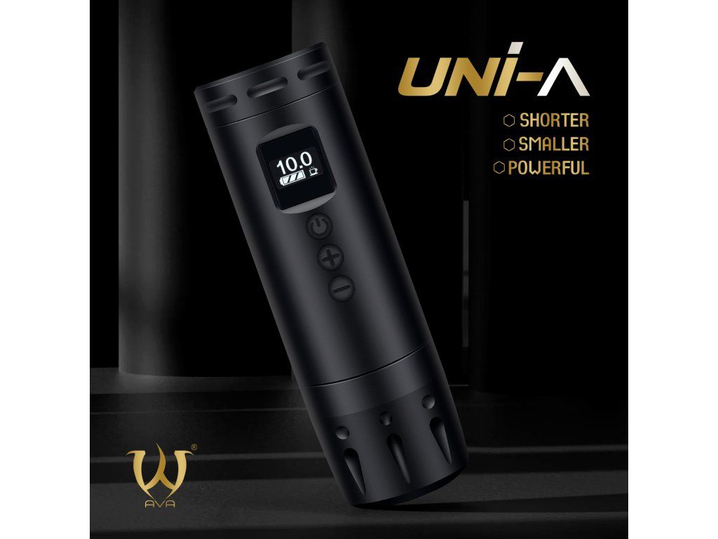 Die AVA UNI A in Schwarz mit 3,5 mm Hub ist eine kompakte, kabellose Tattoomaschine für den täglichen Gebrauch. Dank ihres kurzen Gehäuses, des OLED-Displays und des austauschbaren Akkus eignet sie sich sowohl fürs Studio als auch für unterwegs.