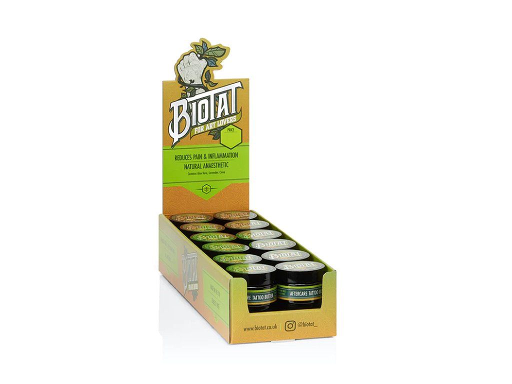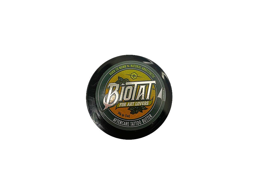 Biotat Aftercare Tatoo Butter - Eine luxuriöse, hochwertige Nachbehandlung mit viel Sheabutter, die Sie als Teil Ihrer täglichen Routine verwenden können, um Ihr neues Tattoo zu heilen. Juckende und empfindliche Tattoos können unangenehm sein. Biotat enthält die starken natürlichen betäubenden Eigenschaften von Nelkenöl mit Lavendel, die beruhigend wirken und Rötungen und Entzündungen reduzieren.