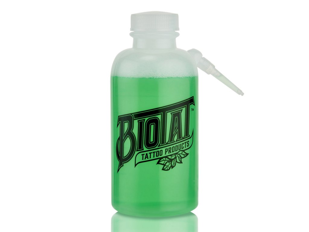 Die Biotat Flasche mit 500 ml Fassungsvermögen ist mit einem weiten Hals ausgestattet, der das Befüllen von Flüssigkeiten einfach und ohne Verschütten ermöglicht. Besonders geeignet für Green Soap und andere im Tattoostudio gebräuchliche Flüssigkeiten.