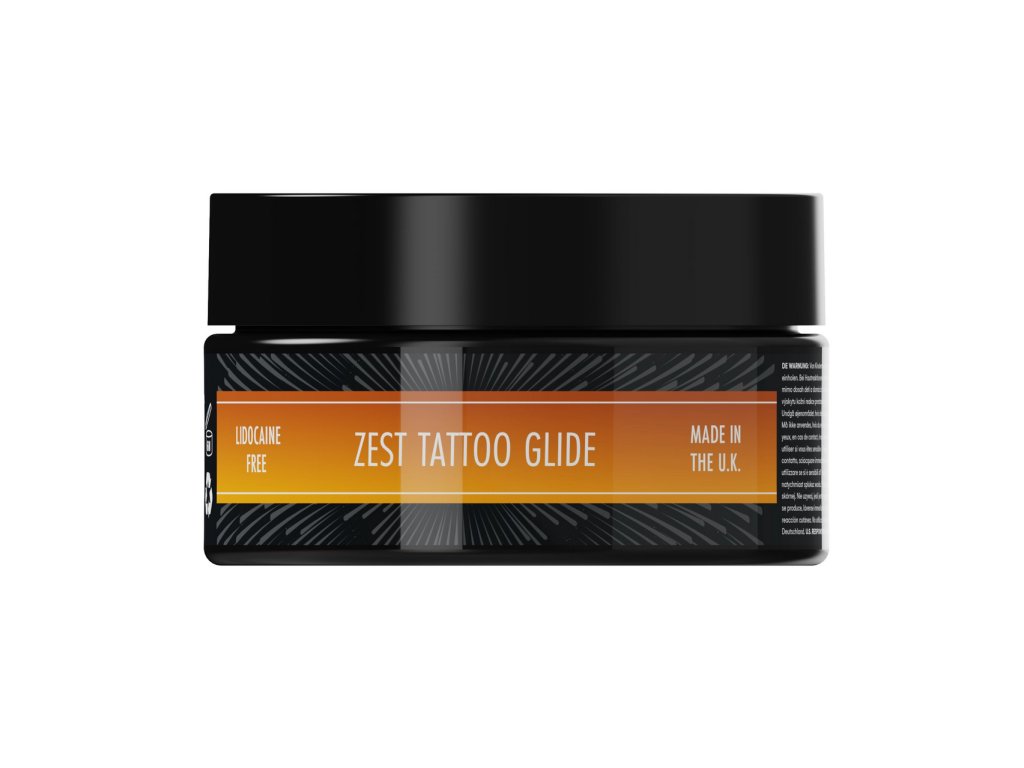 Eine kleine Menge Butter während des Tätowierens auf die tätowierte Stelle auftragen. Das Produkt beruhigt die Haut, lindert Schmerzen und sorgt für einen frischen Zitrusduft während der Arbeit.