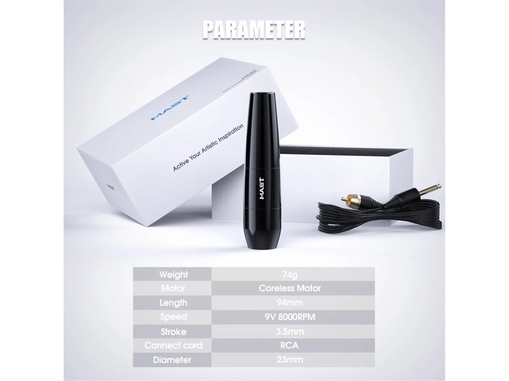 Die Maschine ist mit einem bürstenlosen Motor und einem festen Hub von 3,5 mm ausgestattet, was eine ausgewogene Leistung ermöglicht, die sich sowohl für feine Schattierungen als auch für leichte Linien eignet. Die Stromversorgung erfolgt über einen RCA-Anschluss, wodurch die Kompatibilität mit Standardnetzteilen in Studios gewährleistet ist.