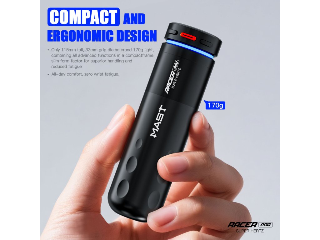 Dank des integrierten Akkus direkt im Griff ist das Gerät kürzer (nur 10 cm) und perfekt ausbalanciert – der niedrige Schwerpunkt sorgt für maximale Stabilität und Kontrolle beim Tätowieren.