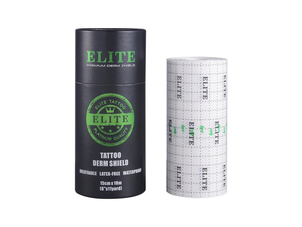 - eine Schicht aus mattem PU, die Teil der Bandage ist, die nach dem Tätowieren auf der Haut verbleibt und sie schützt und optimale Atmungsaktivität und Dehnbarkeit ermöglicht
