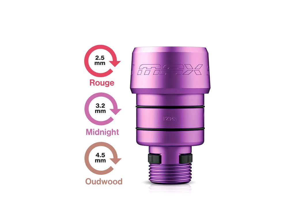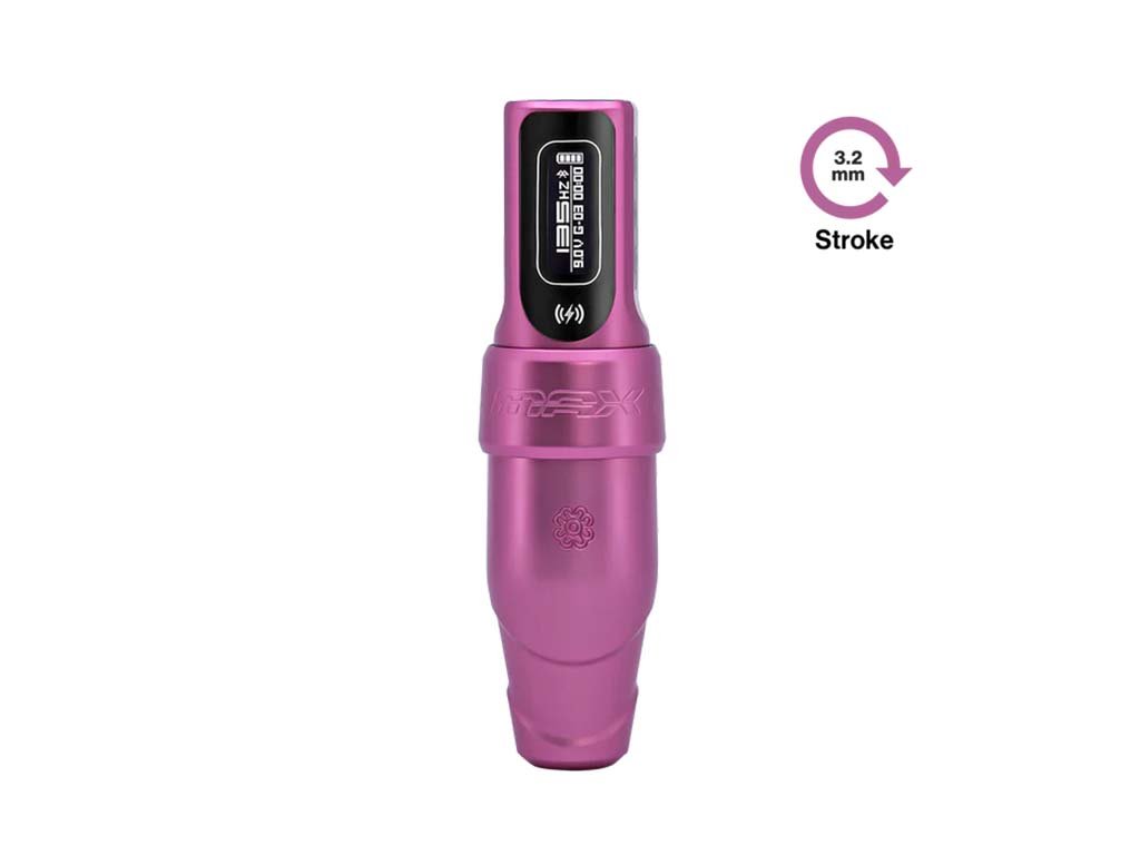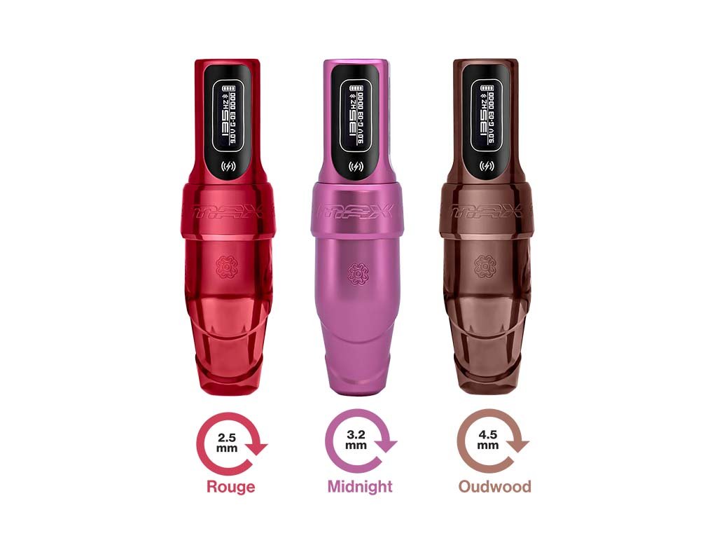 Der Flux S Max verfügt über ein neues digitales Display, integrierte Menüs mit dem PowerBolt Il-Akku, die eine perfekte Kontrolle über alle Funktionen und Einstellungen der Maschine ermöglichen. Mit dem PowerBolt Il kann der Künstler ganz einfach durch die Menüoptionen navigieren, den Give einschalten und einstellen, die Batterielebensdauer ablesen und das Gerätedisplay durch die Auswahl von Hertz oder Volt und 0,1 oder 0,5 Einstellungsschritten personalisieren. Der Flux S Max verfügt über eine neue, hochmoderne Technologie, die lernt, wie Sie arbeiten möchten, von der Art der Tinte über die Spitze/Nadel bis hin zur Stärke des Drucks, den Sie ausüben.