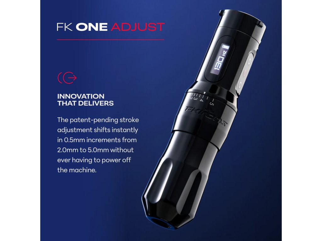 Die FK ONE Adjust ist eine innovative, kabellose Maschine mit einem patentierten Hubverstellsystem, mit dem Sie die Hublänge von 2,0 - 5,0 mm stufenlos verändern können, ohne die Maschine ausschalten zu müssen. Damit lassen sich alle Stile bearbeiten - von feinen Linien bis hin zu satten Füllungen.