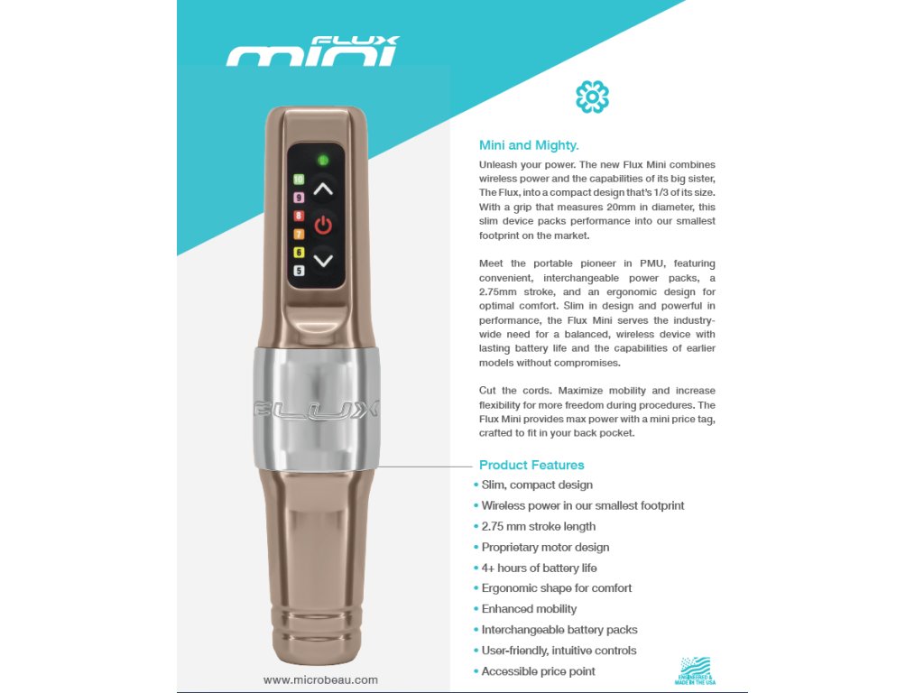 Schlankes Design und starke Leistung – der Flux Mini erfüllt die Bedürfnisse der gesamten Branche nach einem ausgewogenen, kabellosen Gerät mit langer Akkulaufzeit und den Fähigkeiten früherer Modelle ohne Kompromisse.