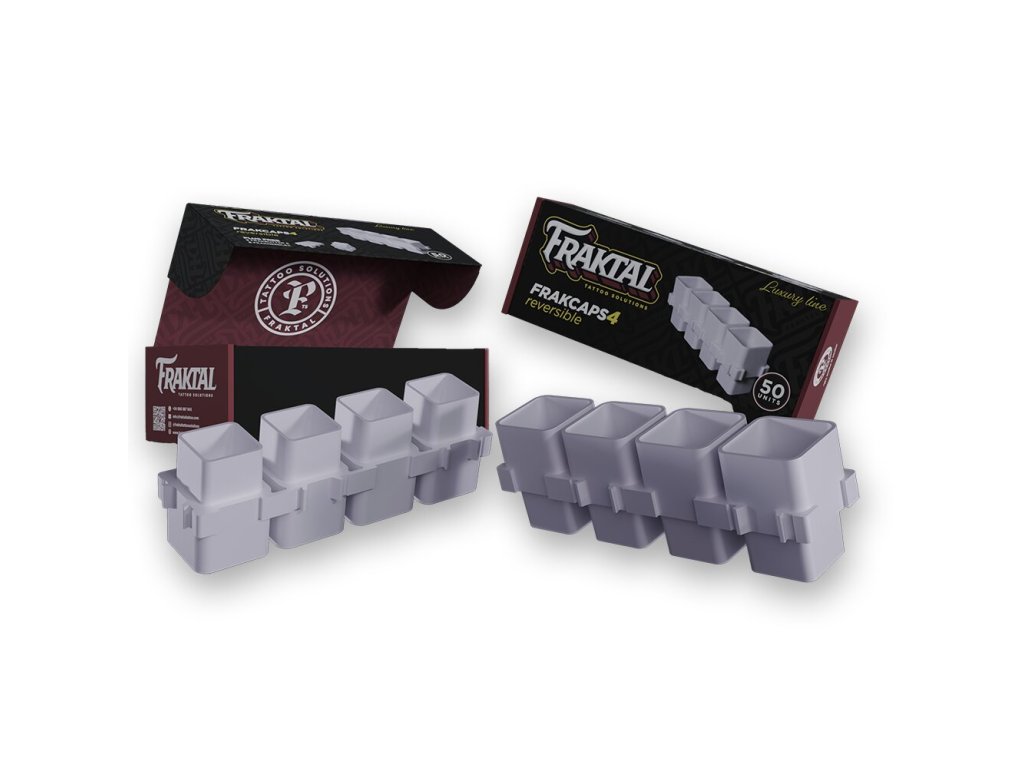 FrakCaps4 sind eine praktische Lösung zur Organisation des Tätowierarbeitsplatzes. Dank stabiler Kunststoffkonstruktion und reversiblem Design bieten sie eine sichere Aufnahme der Farbe und minimieren das Risiko des Verschüttens. Jedes Modul enthält vier Kammern in zwei verschiedenen Kapazitäten (10 ml und 14 ml), was eine flexible Nutzung beim Arbeiten mit mehreren Farbtönen oder größeren Farbvolumen ermöglicht.