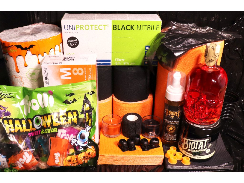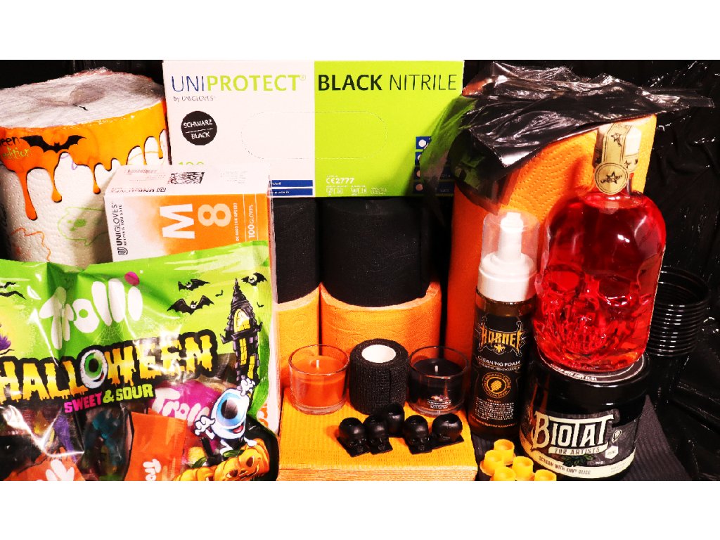 Halloween Season Pack ist das umfangreichste Halloween-Set, das beide Themen vereint – Orange und Schwarz. Es enthält zwei Duftkerzen von Yankee Candle (Pumpkin Cinnamon Swirl und Black Coconut), schwarze und orange Handschuhe, Toilettenpapier und Unterlagen in beiden Farben. Ergänzt wird das praktische Material durch Saferly Cups in Schädel-3D-Form, ein Schutzband für den Griff, medizinische Becher und thematische Süßigkeiten von Trolli. Außerdem ist eine Seife im Glas mit Totenkopf enthalten, die dem Studio eine ausgeprägte Halloween-Atmosphäre verleiht.