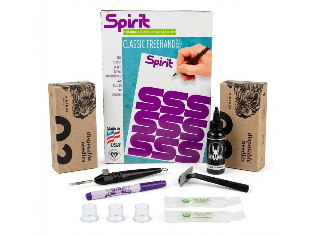 Ein komplettes Set für die Handpoke-Technik, die manuelles Tätowieren ohne Maschine ermöglicht. Enthält Werkzeuge, Tinte, Transfermedium und Verbrauchsmaterialien für einen sicheren und kontrollierten Prozess. Alles, was Sie für präzises manuelles Tätowieren ohne Maschine benötigen, in einem Paket.