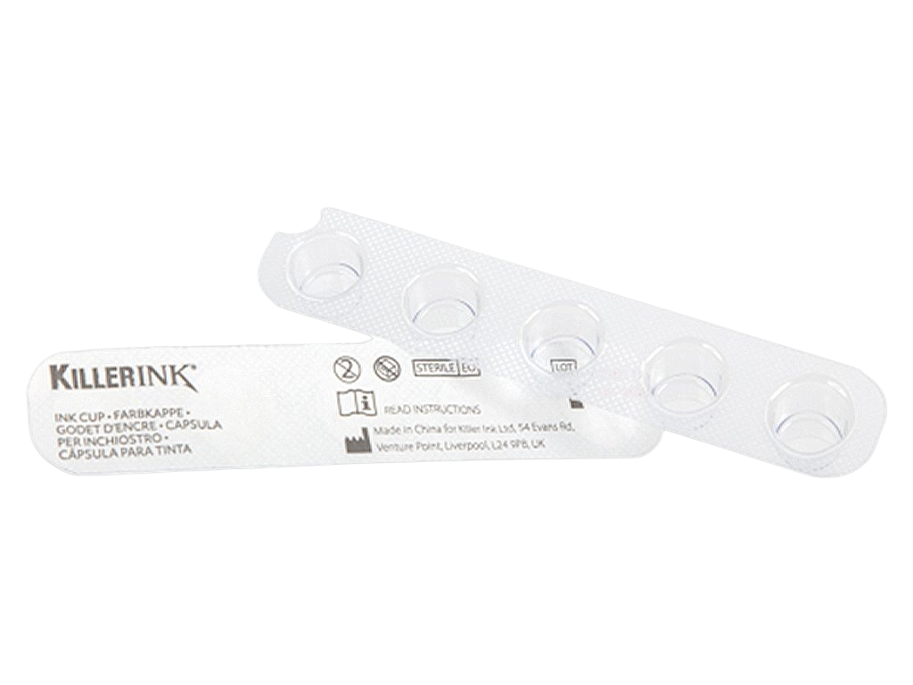 Das Set eignet sich für Handpoke-Arbeit mit kleineren Motiven, kleinen Füllungen und zum Testen eines bestimmten Farbtons. Die Reihe von Einwegkappen hilft, die Dosierung übersichtlich und die Arbeitsfläche sauber zu halten.