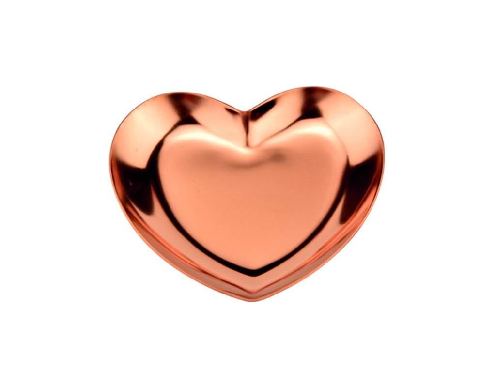 Das stilvolle herzförmige Tablett aus poliertem Edelstahl ist eine praktische und elegante Ergänzung für jedes Studio.