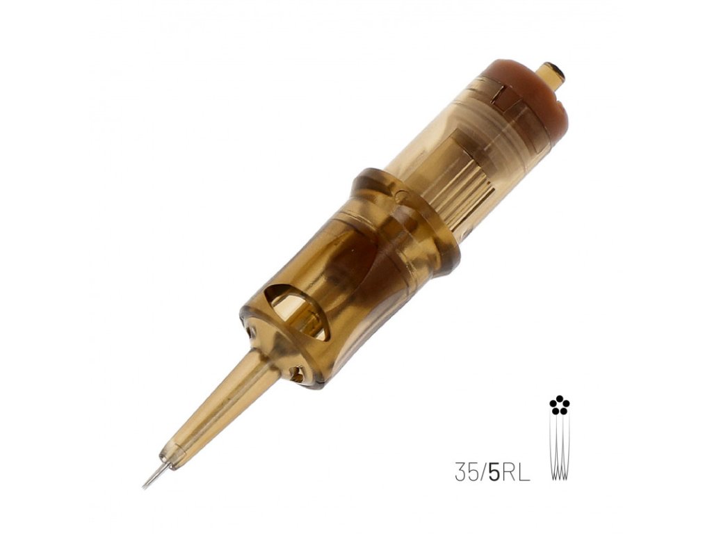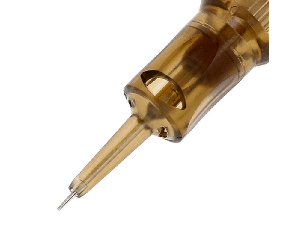 Die Nadeln sind kreisförmig angeordnet und ihre Spitzen laufen in einem Punkt zusammen, was für scharfe und ausdrucksstarke Linien sorgt. Das neue Hybridsystem verbessert zudem die Stabilität und die gleichmäßige Bewegung über die Haut und ermöglicht so ein gleichmäßiges und kontrolliertes Tätowieren.