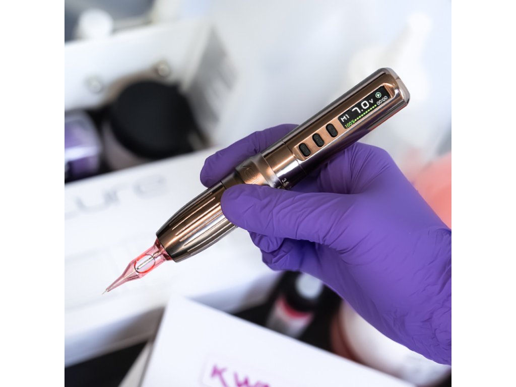 Die kabellose Kwadron PMU Velure Maschine in kaffeebraunem Design vereint Präzision, Komfort und Bewegungsfreiheit ohne Kabel. Durch den regulierbaren Hub von 2,0 bis 3,5 mm und die Nadelauslenkung bis zu 4,0 mm erhalten Sie volle Kontrolle über Intensität und Pigmenttiefe.