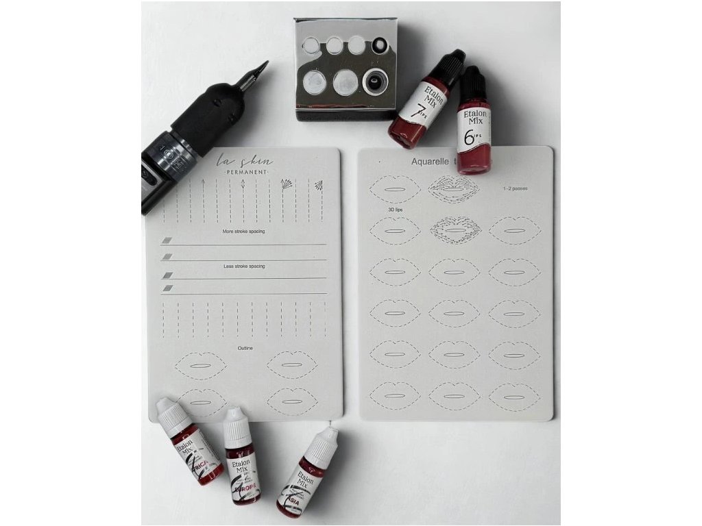 Laskin Permanent Latex Lips ist eine Übungshaut aus hochwertigem Latex, die für die Perfektionierung der Techniken des Permanent Make-ups an den Lippen entwickelt wurde. Dank der vorgezeichneten Lippenformen können gleichmäßige Striche, Schattierungen und 3D-Effekte geübt werden.