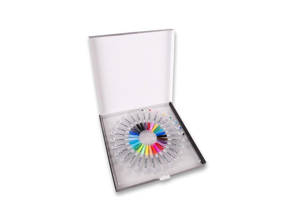 Permanenter Tintenmarker für die meisten hellen und dunklen Oberflächen. Das Set enthält 20 Standardfarben von Permanentmarkern mit dünner F-Spitze und 8 Standardfarben von Permanentmarkern mit ultradünner UF-Spitze. Spurlänge ca. F 225 m und UF 650 m. für alle Arten von Papier, Pappe, Kunststoff, Holz, Textilien, Keramik und Porzellan schnell trocknend wasser- und lichtbeständig keine Fixierung nach der Veredelung erforderlich made in USA grauer Kunststoffkörper, Kappe und Spitze in Nachfüllfarbe 0,5 mm Rundspitze 0,9 mm Rundspitze Dauer und Farbintensität der Grafik sind abhängig vom gewählten Material und der Markerfarbe. Um einen dauerhaften Effekt zu erzielen, muss die Oberfläche vor der Verwendung des Markers gereinigt und entfettet werden, und die fertige Grafik muss auf eine für das gewählte Material geeignete Weise befestigt werden.