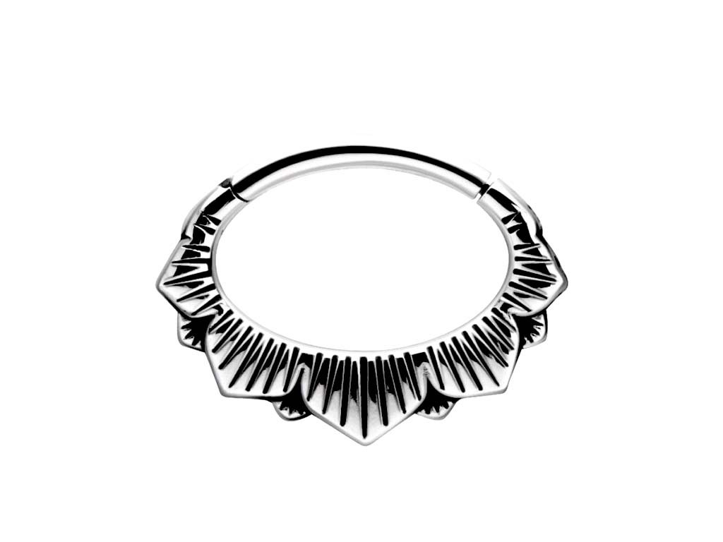 Piercing Wildcat Floral Hinged, funktioniert als Klick-Verschluss, um die Manipulation beim Öffnen und Einsetzen des Piercings zu erleichtern. Dieses auffällige Piercing, das für die Nasenscheidewand geeignet ist, hat ein florales Design mit einer Dicke von 1,2 mm und einem Durchmesser von 6 mm. Dieser Schmuck kann auch im Ohr platziert oder als Smile-Piercing verwendet werden.