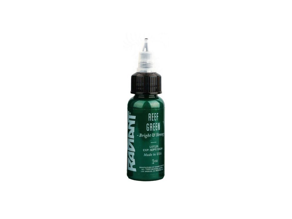 Radiant Ink Reef Green ist eine grüne Tattoo-Farbe aus dem Farbsortiment der Marke Radiant Ink. Das Produkt ist für die Anwendung mit einer Tattoo-Maschine vorgesehen. Die Farbkonsistenz entspricht dem gängigen Standard für flüssige Tattoo-Pigmente, die in professionellen Studios verwendet werden.