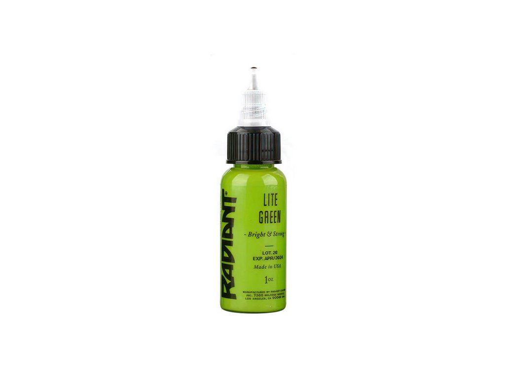 Radiant Ink Lite Green ist eine grüne Tattoo-Farbe aus dem Farbsortiment der Marke Radiant Ink. Das Produkt ist für die Anwendung mit einer Tattoo-Maschine vorgesehen. Die Farbkonsistenz entspricht dem gängigen Standard für flüssige Tattoo-Pigmente, die in professionellen Studios verwendet werden.