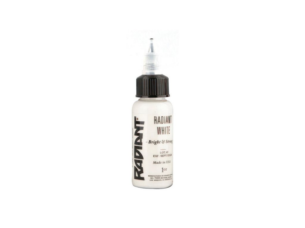 Radiant Ink Radiant White ist eine weiße Tattoo-Farbe aus der Farbpalette der Marke Radiant Ink. Das Produkt ist für die Anwendung mit einer Tattoo-Maschine vorgesehen. Die Farbkonsistenz entspricht dem gängigen Standard für flüssige Tattoo-Pigmente, die in professionellen Studios verwendet werden.