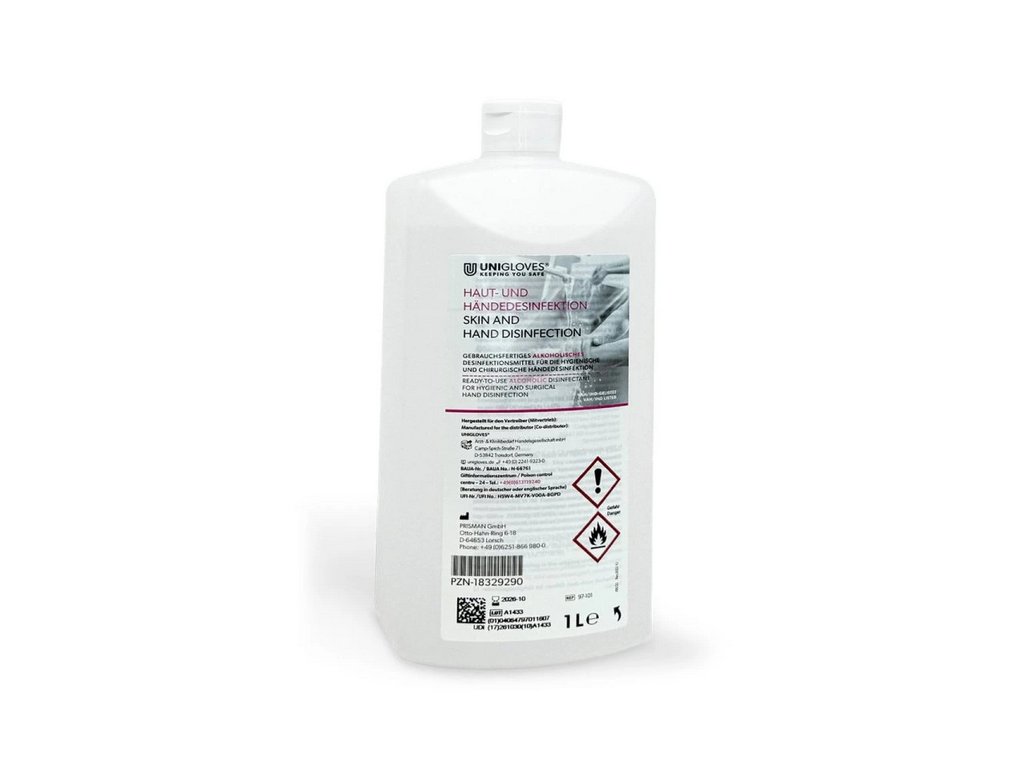 UNIGLOVES Hand- und Hautdesinfektionsmittel in der 1-Liter-Packung ist ein farbloses, gebrauchsfertiges Produkt, das nicht verdünnt werden muss. Es ist dermatologisch getestet und hat sehr gute Ergebnisse erzielt, was seine Hautverträglichkeit und Eignung auch für Menschen mit empfindlicher Haut garantiert.
