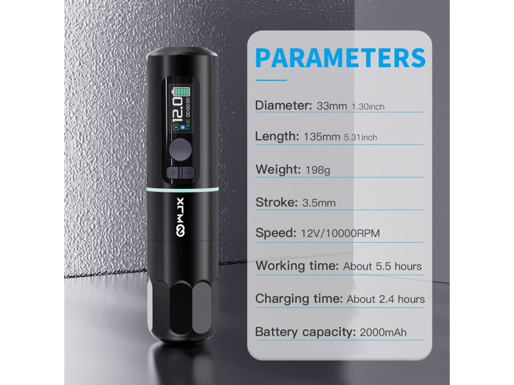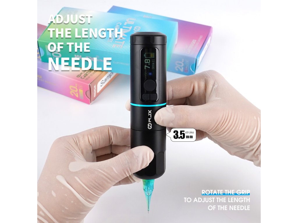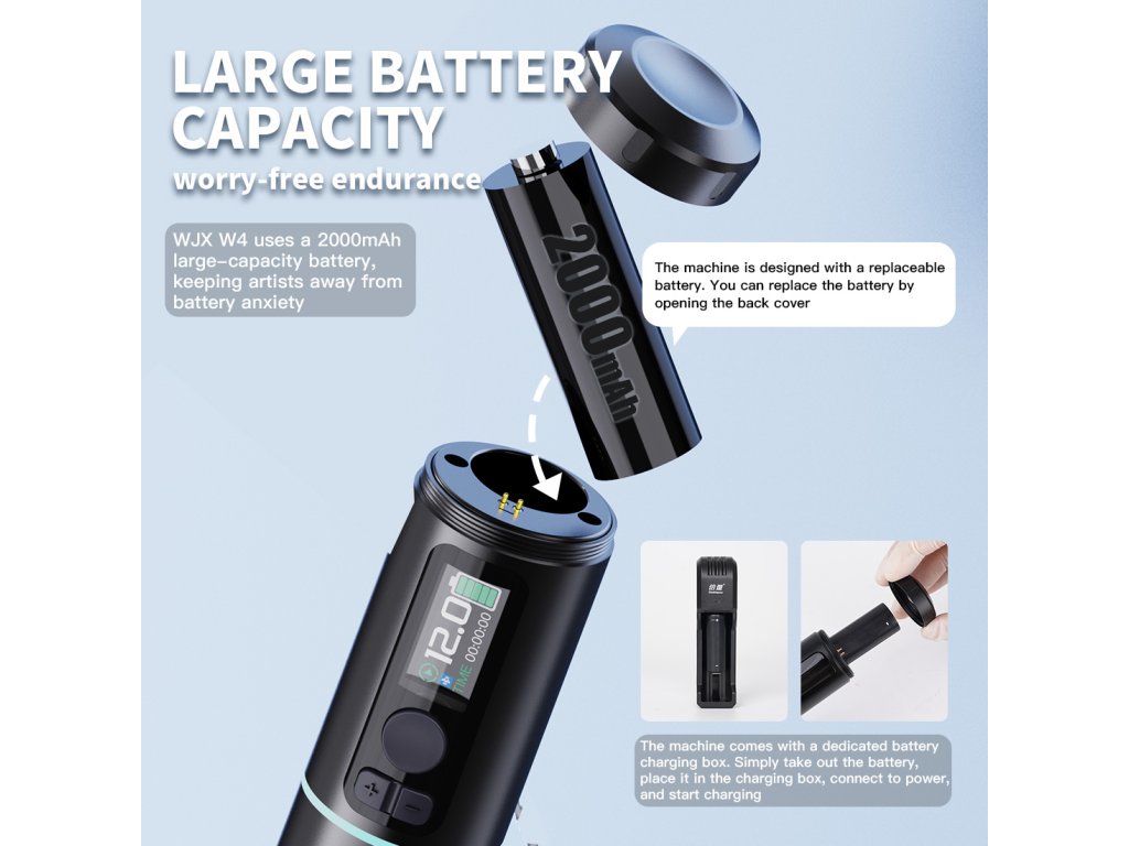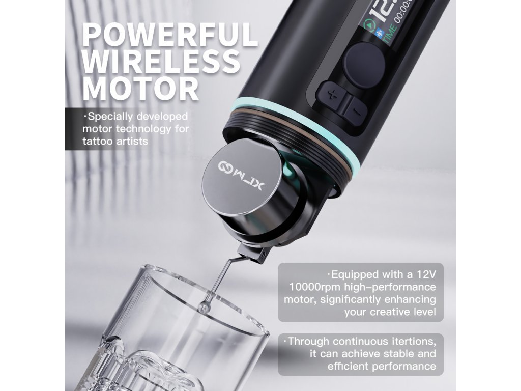 Das WJX W4 ist ein kabelloses Tattoo Pen mit einem leistungsstarken Brushless-Motor, das Präzision, Ausdauer und moderne Funktionen kombiniert. Mit einem Hub von 3,5 mm und einer hohen Geschwindigkeit (10.000 U/min bei 12 V) eignet es sich für verschiedene Techniken, einschließlich Lining und sanftes Shading.
