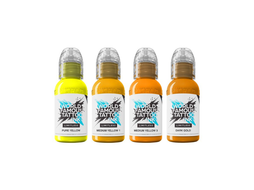 Die World Famous Limitless Shades of Yellow Collection ist ein Set mit 4 Flaschen Tattoo-Tinte in verschiedenen Gelbtönen. Die Tinten wurden nach den neuesten EU REACH-Standards (gültig seit Januar 2023) entwickelt, um eine sichere und hochwertige Lösung für professionelles Tätowieren zu bieten. Die Limitless-Kollektion liefert kräftige und langlebige Farben, die strenge Normen erfüllen und in der Praxis hervorragende Ergebnisse bieten.